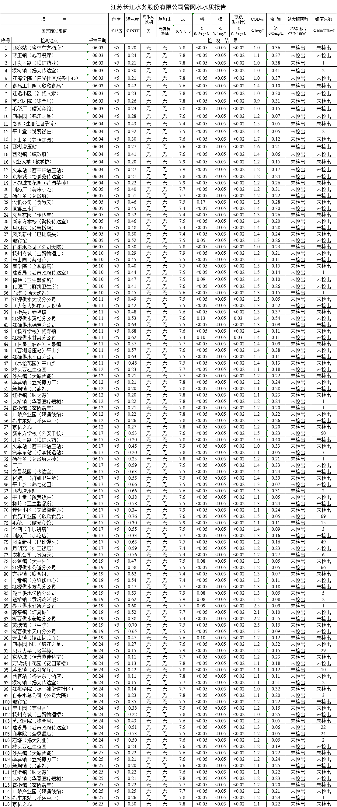 江蘇長江水務股份有限公司管網水水質報告(2019年6月)