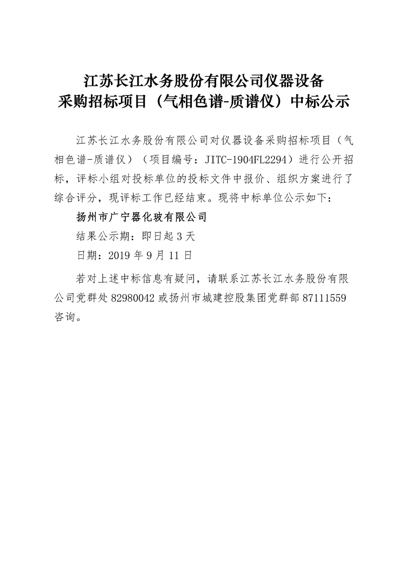 江蘇長江水務股份有限公司儀器設備采購招標項目(氣相色譜-質譜儀)中標公示