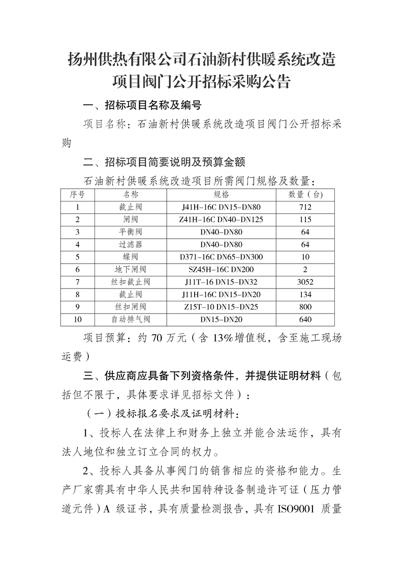 揚(yáng)州供熱石油新村供暖系統(tǒng)改造閥門招標(biāo)文件.docx