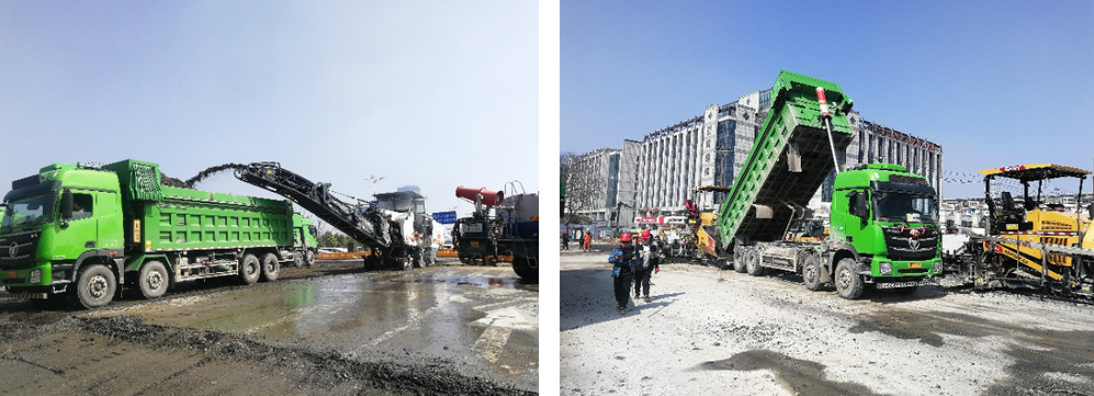 此次交通導改施工分為老路面銑刨與水穩基層攤鋪、瀝青面層攤鋪、畫道路標線和安裝護欄圍擋三個階段。