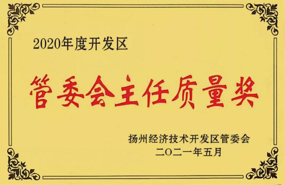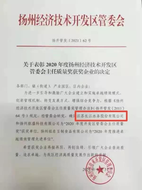 6月4日,揚州市經(jīng)濟技術(shù)開發(fā)區(qū)召開全區(qū)質(zhì)量大會,表彰在質(zhì)量管理方面取得突出成效的企業(yè)組織,長江水務公司榮獲“2020年度開發(fā)區(qū)管委會主任質(zhì)量獎”。