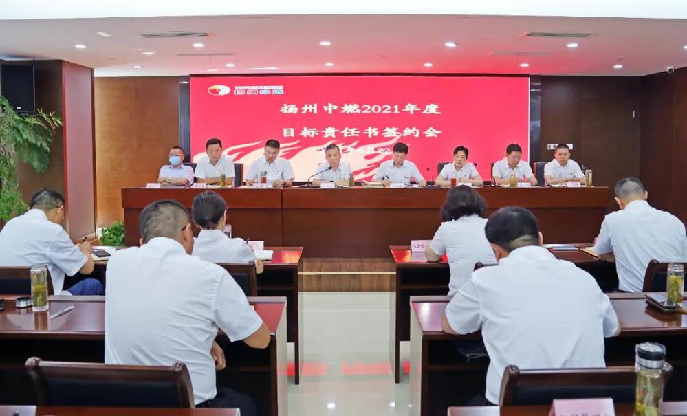 為落實揚州中燃三屆二次董事會決議部署,全面推動公司2021年度各項工作提質增效,6月22日上午,公司召開2021年度目標責任書簽約大會,將年度黨風廉政、經營目標、安全管理、基層黨建工作任務落地落實落細。公司領導班子成員、中層干部近60人參加會議。