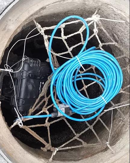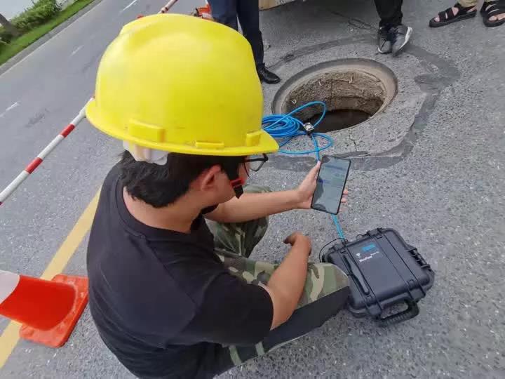 現場工作人員介紹到:“首先將便攜式互相關流量計NFM750,傳感器安裝在不銹鋼漲圈左側90°位置,然后工作人員進入到污水管道中,使用不銹鋼漲圈固定管道,使傳感器正對來水方向,最后將變速器用鐵絲掛在井口,線纜置于防墜網上方。安裝結束后,可以通過手機端屏幕看到管道內瞬時流量、液位、流速、溫度、累計流量。互相關流量計NFM750采用特殊的材質,可以避免腐蝕和磨損,減少安裝和維護費用。”