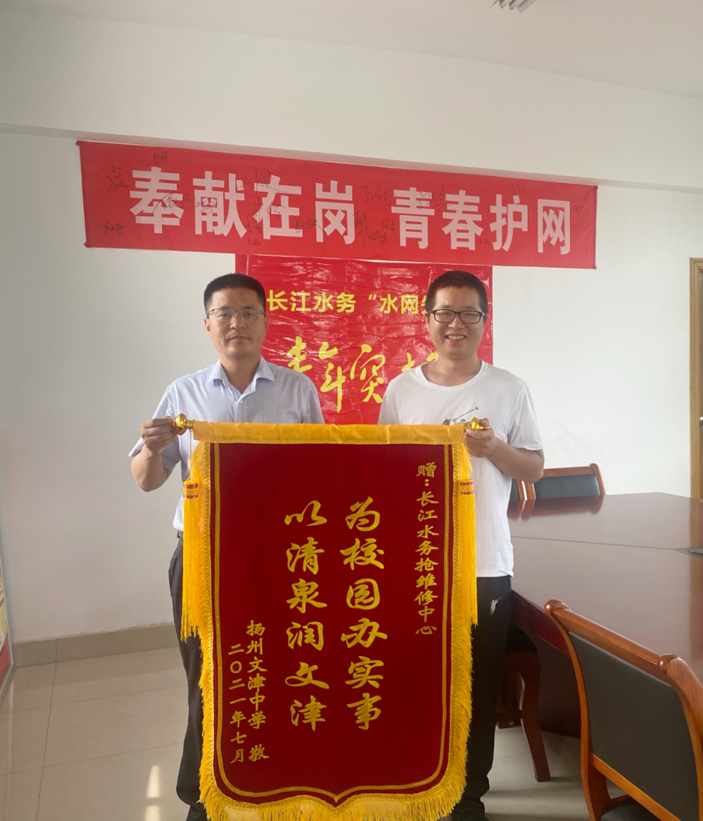 近日,文津中學為長江水務搶維修中心送來一面“為校園辦實事,以清泉潤文津”的錦旗,對長江水務“水網先鋒突擊隊”優質高效解決學校用水難題表示衷心感謝。