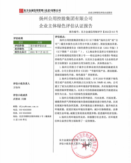 根據評估結果,東方金誠確認揚州公用控股的綠色業務符合國家發展改革委等七部門發布的《綠色產業指導目錄(2019年版)》和人民銀行等三部門發布的《綠色債券支持項目目錄(2021年版)》要求,公司經營的環境表現、社會表現和公司治理的綜合綠色化程度較高。