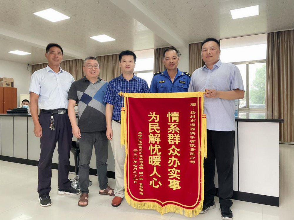 7月26日早晨,高郵市送橋鎮天山社區田莊組的居民冒著大雨,將一面寫有“情系群眾辦實事 為民解憂暖人心”的紅色錦旗送到長江水務湖西供水公司,感謝水務人解決了長期困擾他們的夏季水壓不足問題。