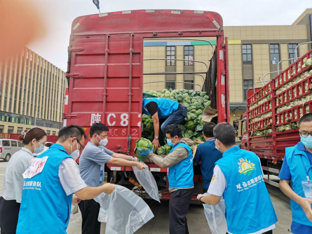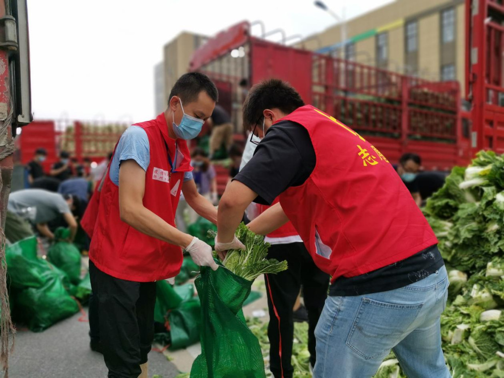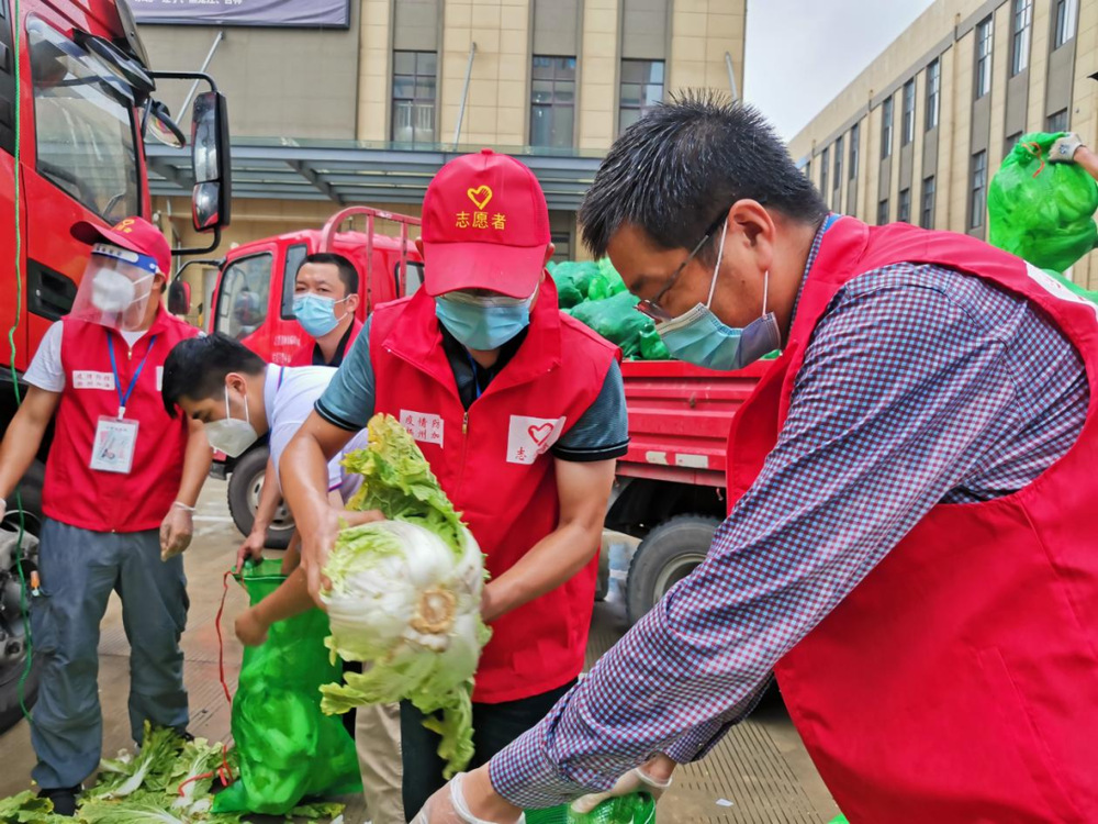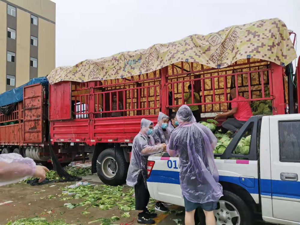由于蔬菜數量龐大,為保障居民能夠及時拿到“愛心菜”,13:30,城控集團又從各志愿服務小組緊急抽調50名志愿者奔赴萬噸冷鏈進行現場支援。