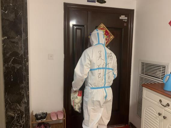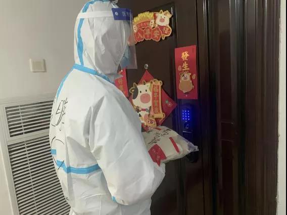 說干就干,大家迅速翻找出此前已經(jīng)整理好的業(yè)主資料和信息,從中挑選出空巢老人住戶和封閉隔離住戶,然后換上防護(hù)服,推上小推車,前往各樓棟,進(jìn)行分發(fā)。分發(fā)時(shí),還細(xì)心詢問了業(yè)主的口味,盡量滿足大家的喜好。