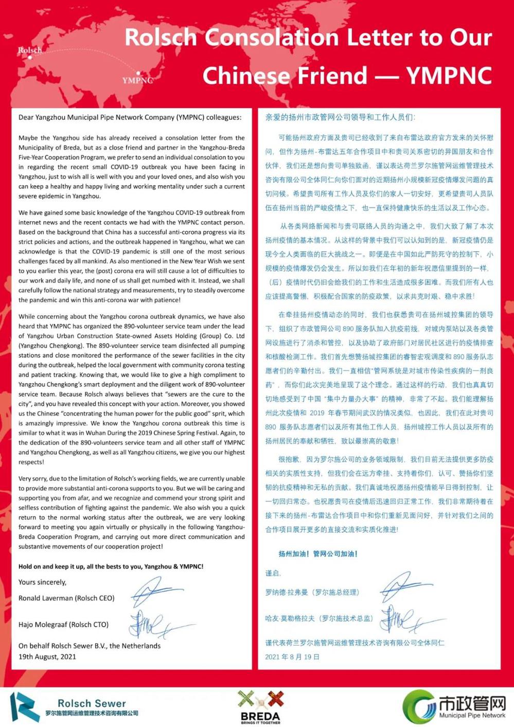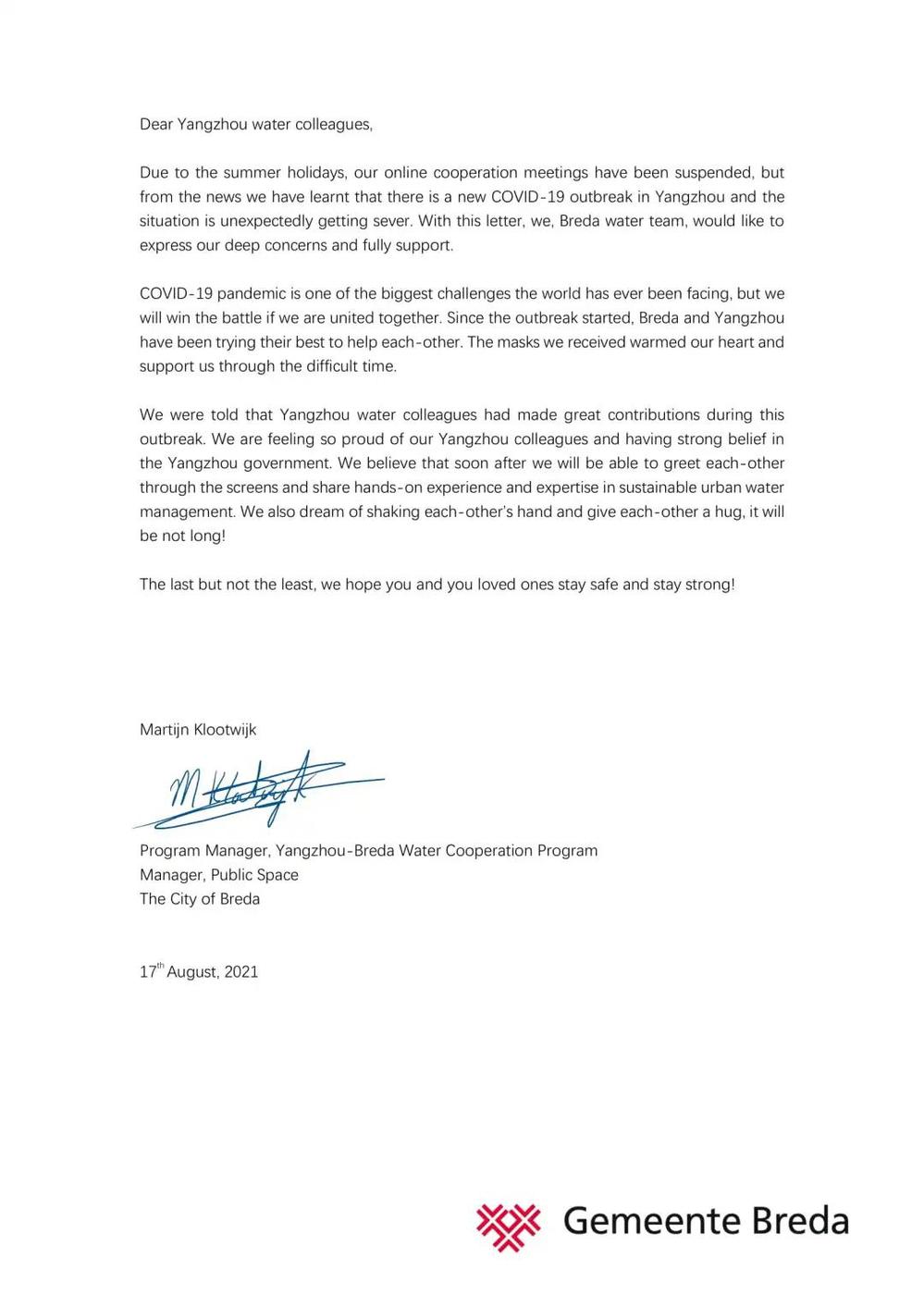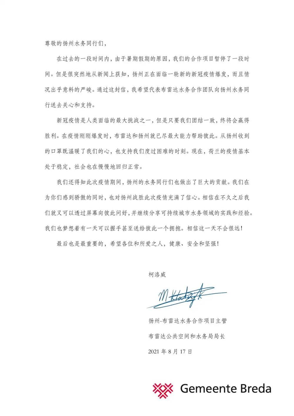 8月18日,在我市新冠肺炎疫情防控的攻堅時刻,城控集團收到荷蘭布雷達市公共空間和水務局以及羅爾施管網運維管理技術咨詢有限公司發來的暖心慰問函。信函中,布雷達市公共空間和水務局局長馬丁·科洛威先生以及羅爾施管網運維管理技術咨詢有限公司總經理羅納德·拉弗曼先生對我市正在蔓延的新冠肺炎疫情表示關切;向身處疫情中的廣大城控集團員工及家人表示誠摯的問候,對“890管網服務隊”代表的“城控”抗疫志愿者奮戰“疫”線的擔當精神,致以崇高的敬意。這封遠隔重洋飛馳而來的慰問信,彰顯了兩座城市間彌足珍貴的友誼,也增強了“城控人”打贏這場疫情防控阻擊戰的信心。