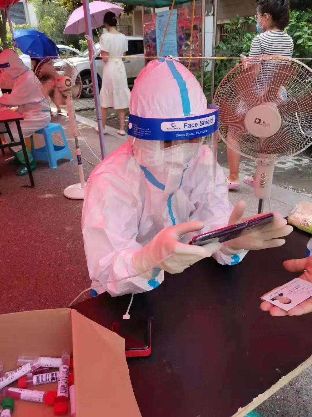 “女兒,我雖然已經五十幾歲了,但是我還能出一份力的!”穿上紅馬甲的葛德林很自信。“爸爸,一位年過半百的人都能有這么高的覺悟,作為年輕人的我也不能掉隊呀!”葛愛婷下定決心要做好志愿服務工作,葛愛婷是供水服務大廳的收費員,平時與數字數據打交道比較多,于是她成了核酸檢測數據信息采錄人員。她把年紀尚小的兩個小孩都丟給家人照顧,在經過疫情防控知識培訓后,每天穿上密不透風的防護服,戴上防護面罩和手套,成了一名“大白”,負責核酸檢測人員信息采樣登記。驗碼、掃描、錄入數據……每次核酸檢測時,這樣的勞動數以萬次,每次她都一絲不茍,深怕出現差錯,影響檢測結果。每天工作十幾個小時,經歷高溫酷暑,渾身濕透毫無怨言。
