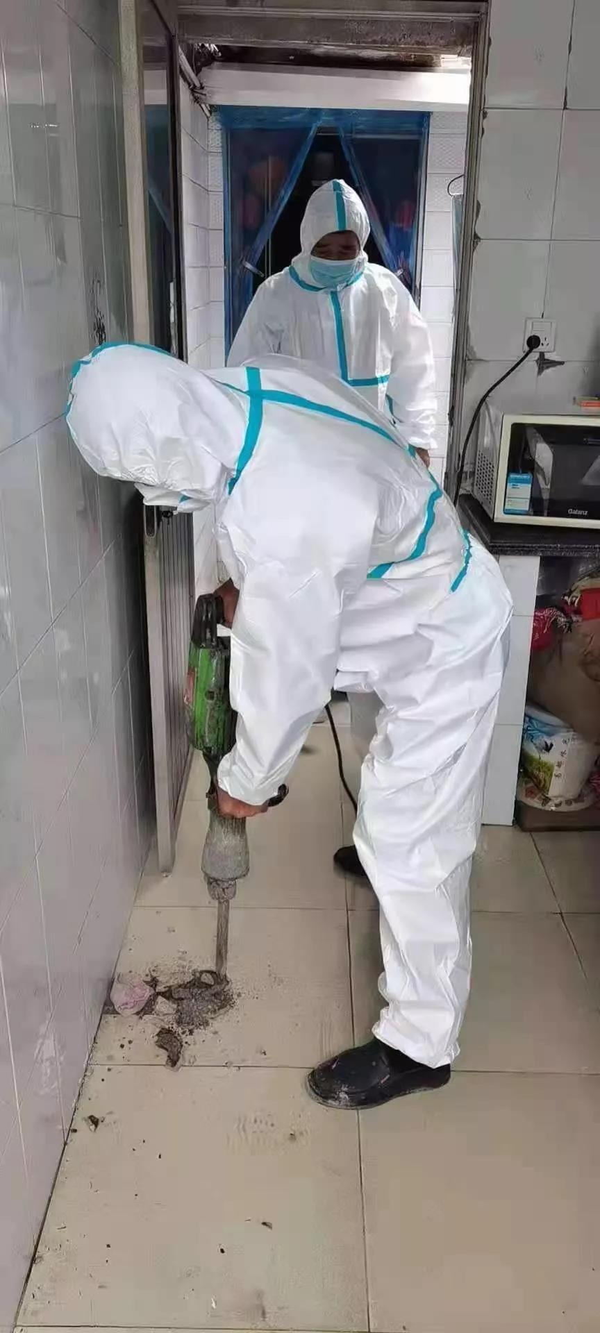 此時身穿防護服的搶修人員,渾身早已被汗水濕透,他們又將維修窗口回填,并貼好地磚,恢復原狀。遺憾的是在疫情時期,實在找不到和曹女士家一模一樣的地磚,只能使用一塊顏色相近的地磚。