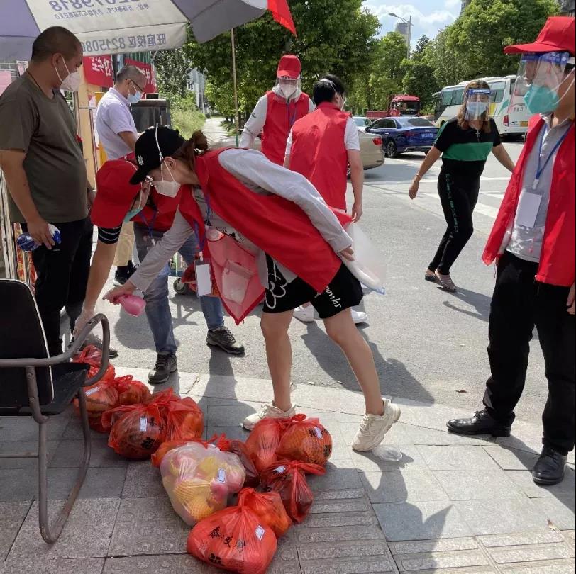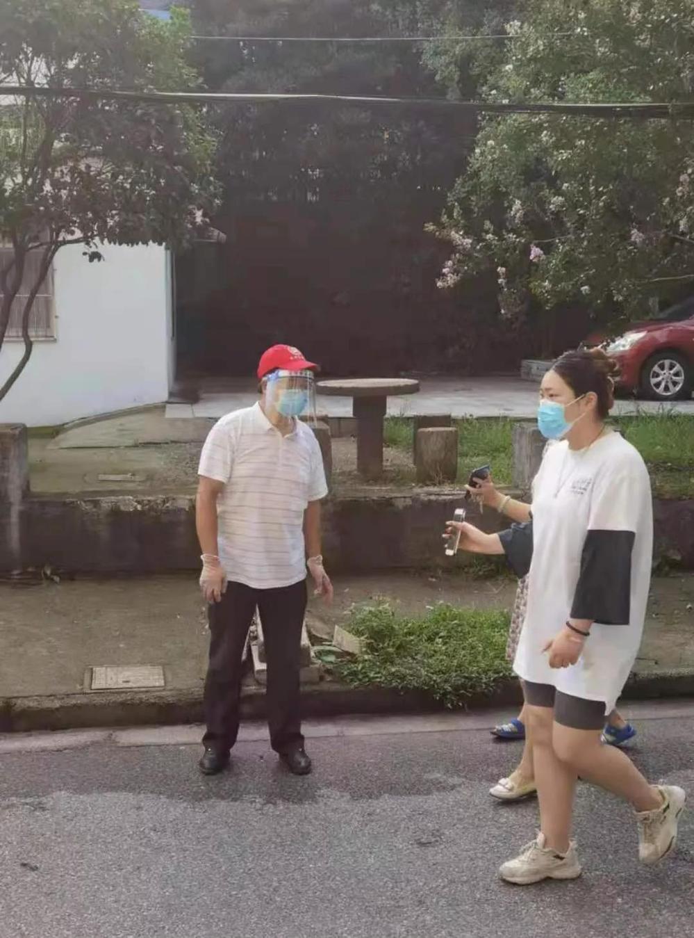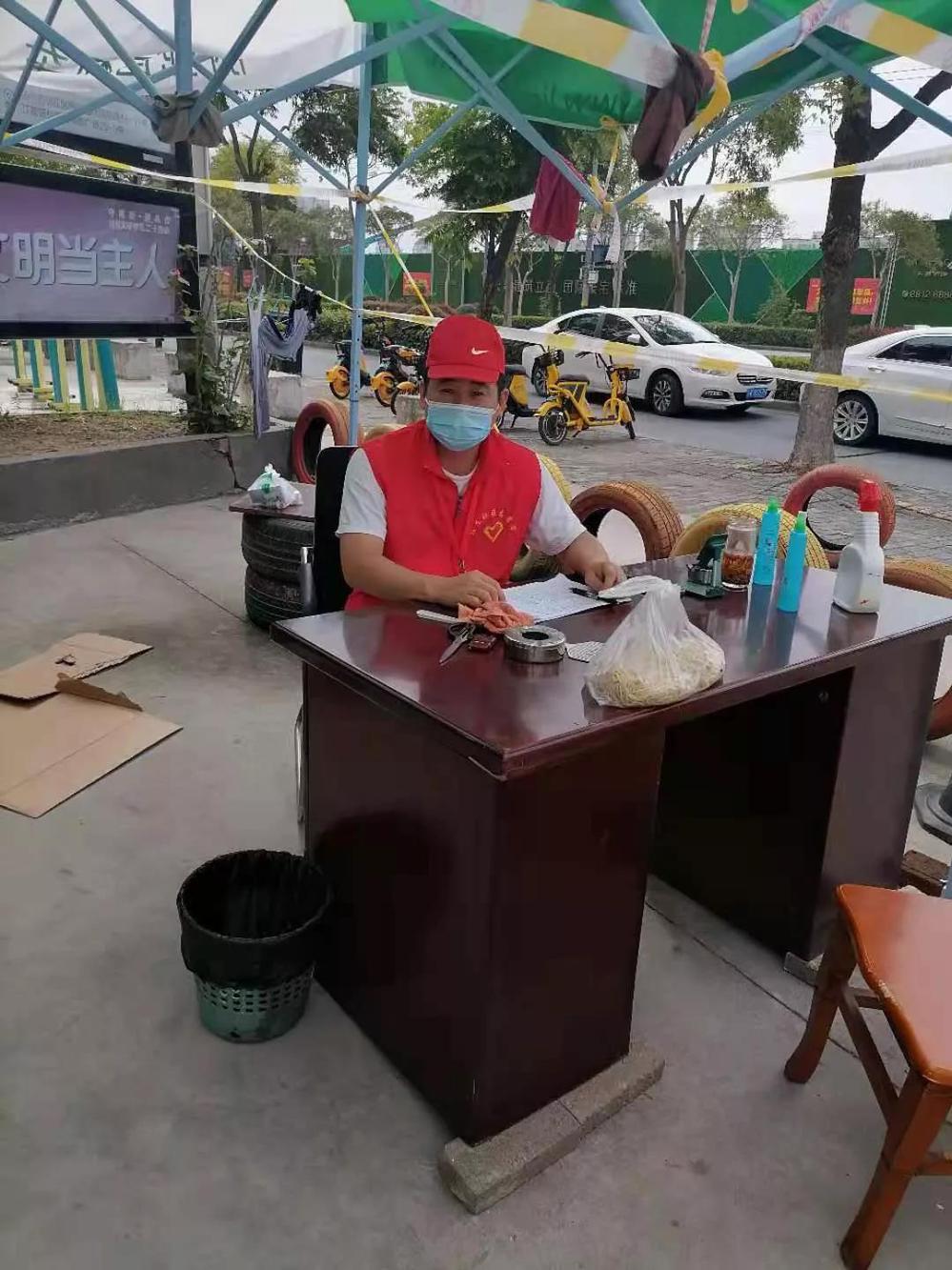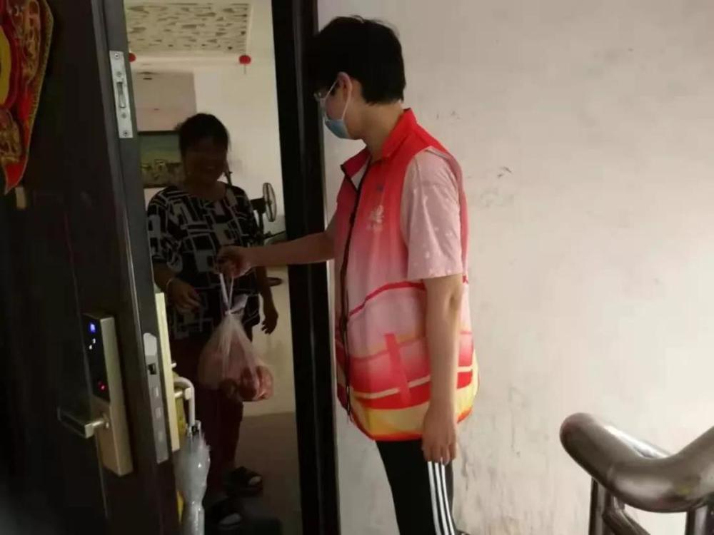 (綜合辦公室周易,在萬福社區幫助小區居民進行物資幫送,牢記時刻保持1米線安全距離)