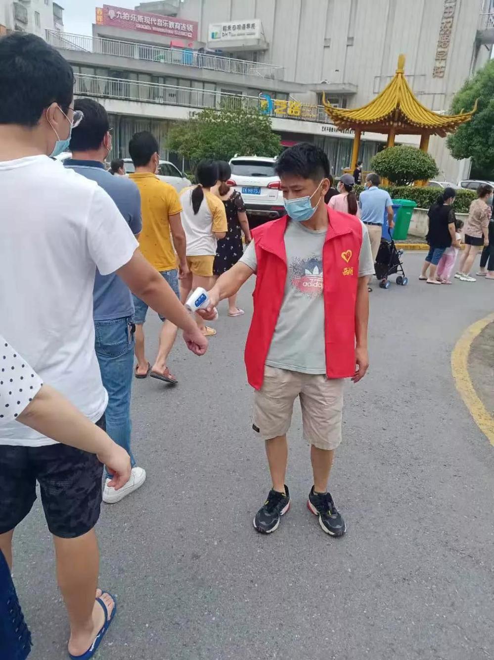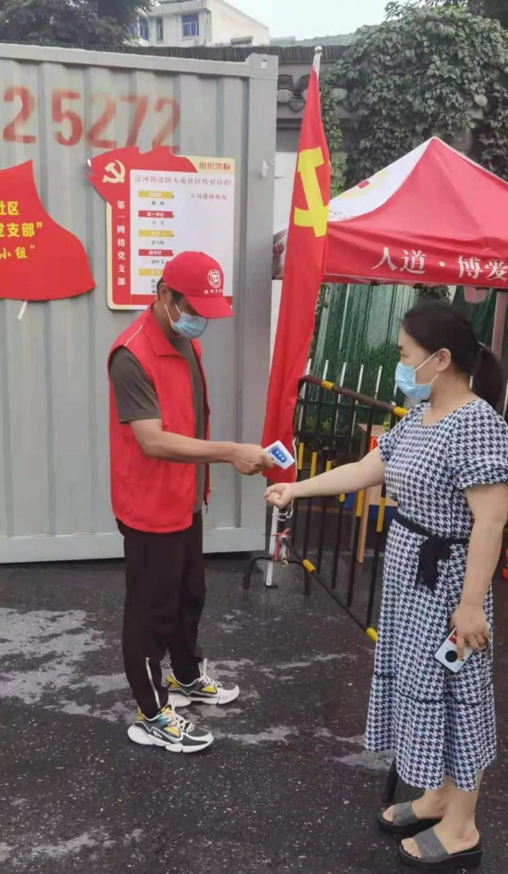 (總工程師辦公室李康文,在司徒村社區為核酸檢測人員進行體溫測量,同時開展1米安全距離勸導)