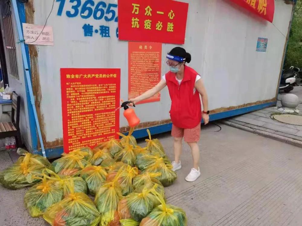 (水質檢測中心吳靖在徐凝門社區為居民平價菜品進行外包裝消毒,并做好居民勸導工作)