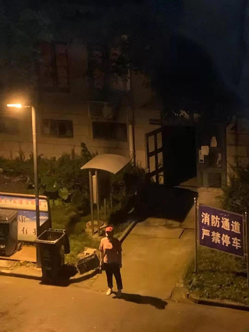 (夜深人靜時刻,生產運行處許佳仍在五里社區萬鴻城市花園小區內路口進行單元樓管控,勸返出樓棟人員進行居家隔離)