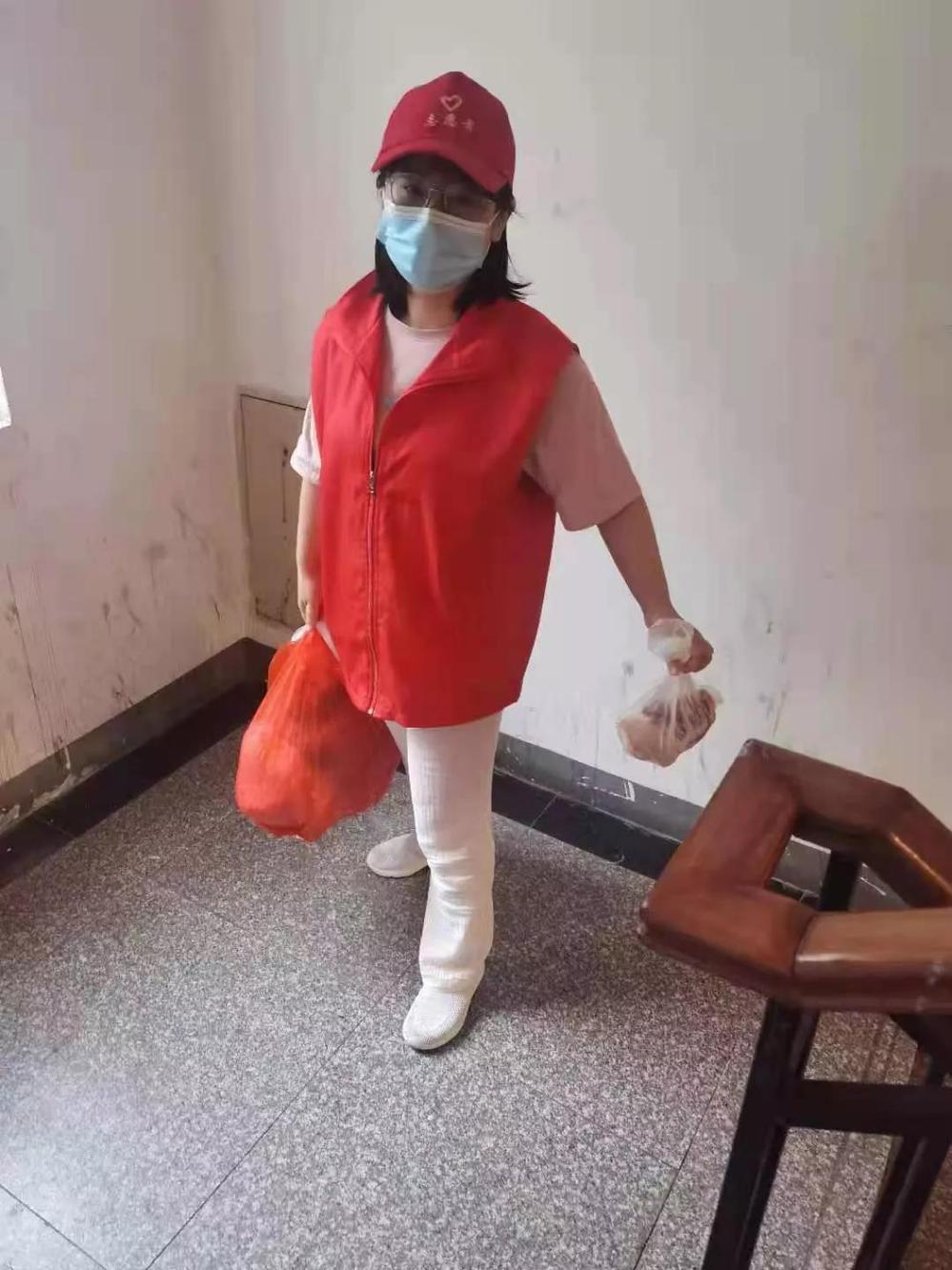 (綜合辦公室孫穎,在萬福社區從事配送物資消毒工作,并將配送的物資按樓棟分類,便于志愿者配送)