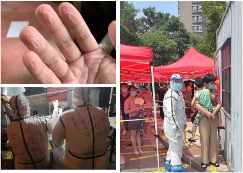7月31日新盛街道大劉社區緊急發布核酸檢測志愿者的招募信息,市民卡公司90后員工劉寶帥看到后,毅然決定放棄周末休息時間,主動加入到這支光榮的隊伍中,成為市民卡公司第一名主動下沉社區的志愿者,為抗擊疫情、守護家園出一份力。在核酸檢測點,劉寶帥頭戴口罩面罩,身穿防護服,頂著炎炎烈日,引導待檢測人員進行注冊、有序登記采集碼以及送樣等,全天完成社區核酸檢測6000人。從白天到黑夜,忙碌奮戰14個小時,防護服換了5套,手上皮膚也因長時間戴防護手套,被汗水泡得浮腫發白,遇到不理解的群眾時,他微笑面對、耐心指導,嗓子都沙啞了。