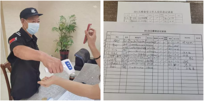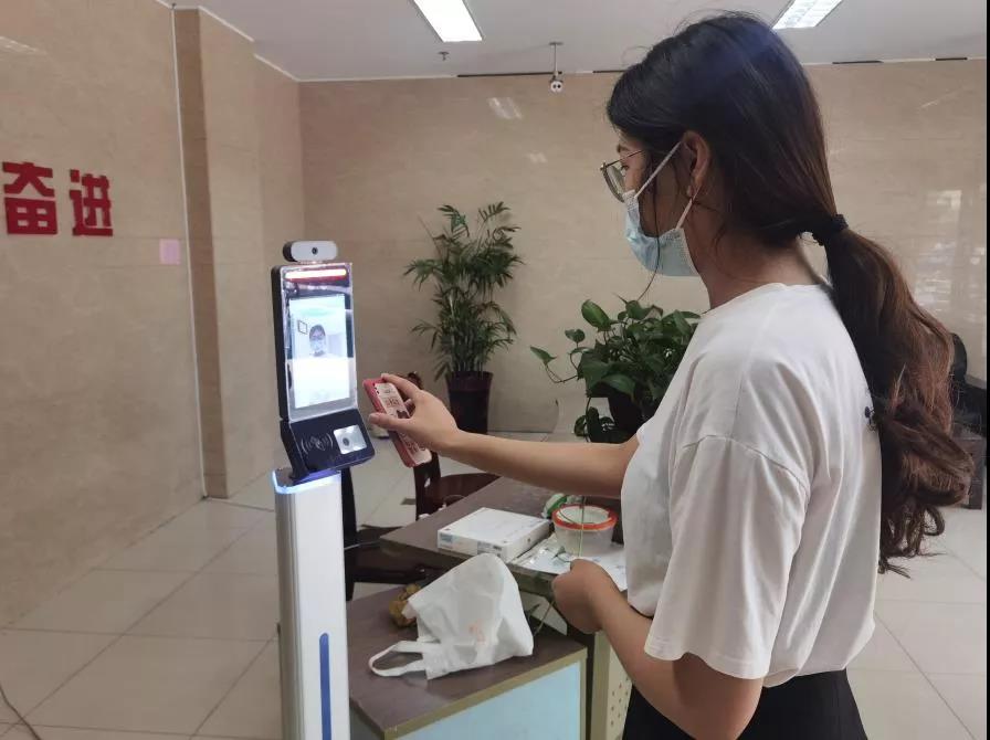 公司入口加強人員出入管理。復工人員在返崗前需向公司提交近三次核酸檢測報告和“兩碼”。保安嚴格把關進出人員全程規范佩戴口罩,通過設立的智能測溫掃碼一體機對到崗職工進行體溫測量,并登記來訪人防疫信息。體溫無異常且蘇康碼綠碼方可進入辦公區。