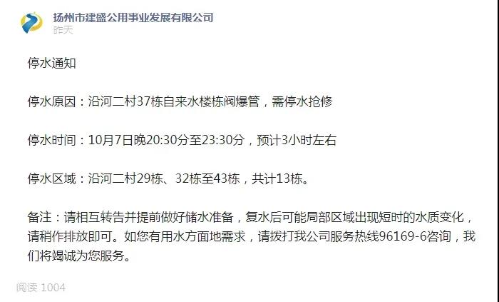 17:15,搶修人員到達現場。經現場排查,系沿河二村37棟108室西側閥門井內DN80自來水水管爆管,需停水搶修。考慮到正值用水高峰期,為不影響周圍群眾正常生活用水,公司決定搶修人員原地待命,做好搶修準備,待用水高峰過后再進行搶修。同時,通過公司微信公眾號等方式發布停水通知,提醒居民做好儲水準備。