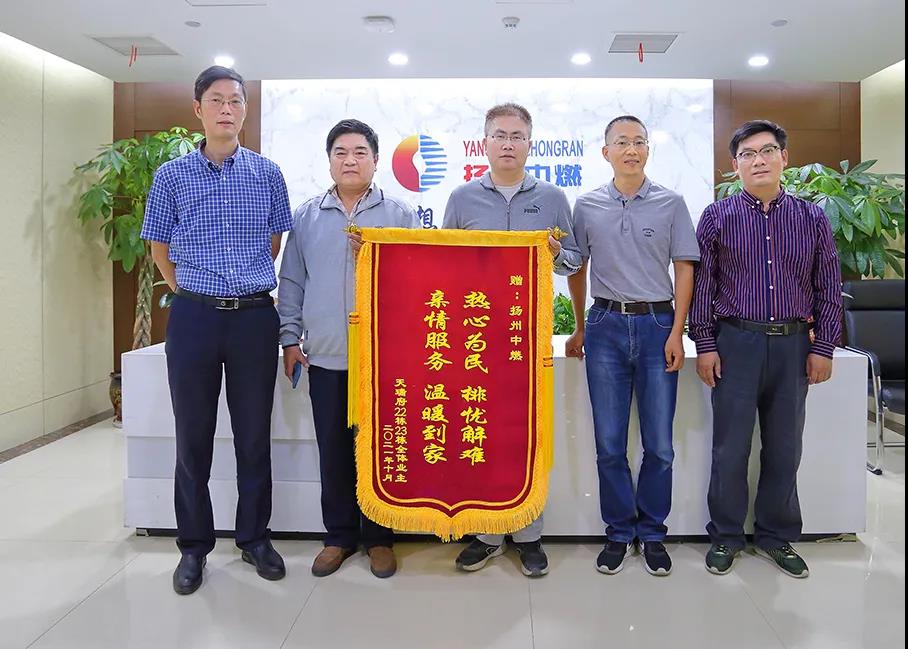 10月11日下午,揚州天瑞府22、23幢的業主代表來到揚州中燃公司,送上了一面“熱心為民、排憂解難,親情服務、溫暖到家”錦旗,以表達對揚州中燃公司為民辦實事的感激之情,讓業主感受到了春天般的溫暖。