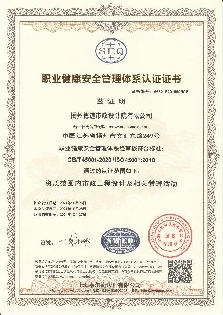 為進一步強化經營管理水平,提升行業核心競爭力,近日,德道設計院經海韋爾奇認證有限公司審定,通過ISO9001質量管理體系、ISO14001環境管理體系、ISO45001職業健康安全管理體系認證。