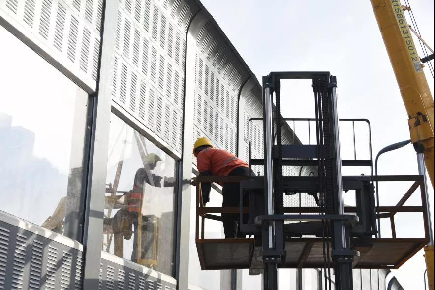 11月14日,伴隨著最后一片屏體在起吊機的操縱下緩緩落位,工人師傅們不慌不忙地對聲屏障進行安裝,經過幾十分鐘的精細調控,江廣快速路主線高架聲屏障已全部安裝完成。