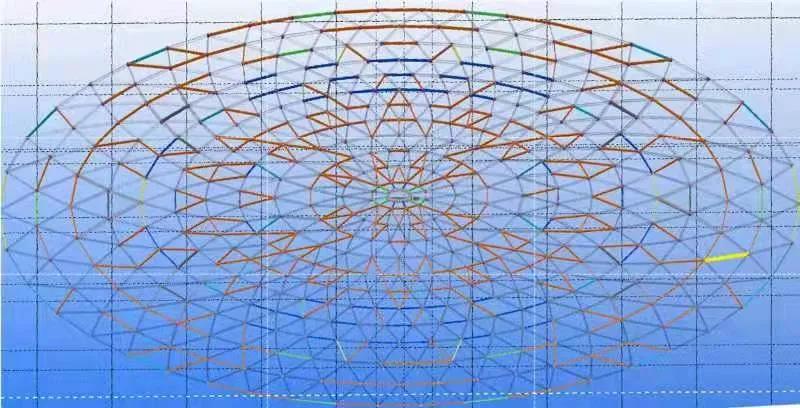 該鋼結構穹頂屬于網殼結構,由鋼管桿件構成68個單元模塊,四周環繞12個樹狀結構支撐,自重約440t,呈橢圓型,長軸92m,短軸51m。
