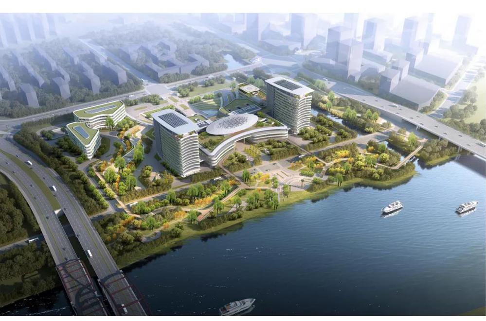 此鋼結構穹頂位于中間裙樓醫技部上方,半透明的金屬華蓋借助運河之勢,日間反射陽光閃亮矚目,夜間透出燈光華麗璀璨,其蛋殼形狀寓意生命的孕育。