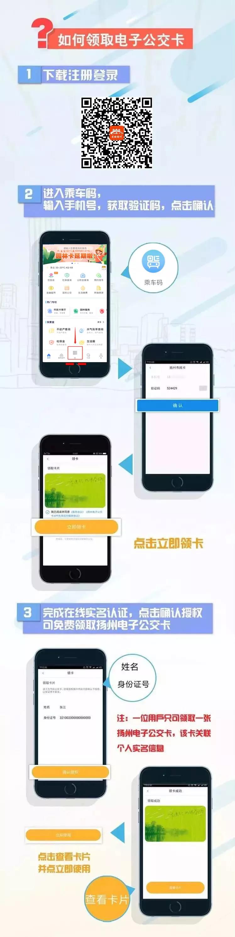 2、下載“我的揚(yáng)州APP”并實(shí)名注冊(cè),領(lǐng)取電子公交卡。步驟如下: