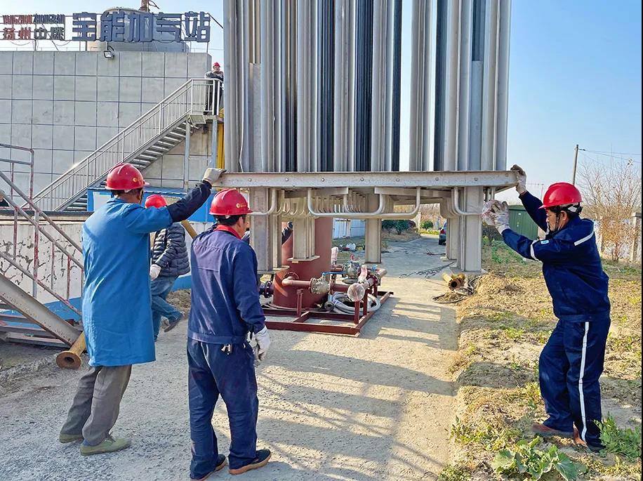 公司超前謀劃做好在極端天氣下氣化保供準備工作。12月13日,在寶能加氣站又安裝一組氣化裝置,該套裝置每小時最大氣化量可達6500立方,在遇極端天氣管網壓力不足的情況,可以向管網持續補充天然氣,助力市區居民冬季生活用氣。