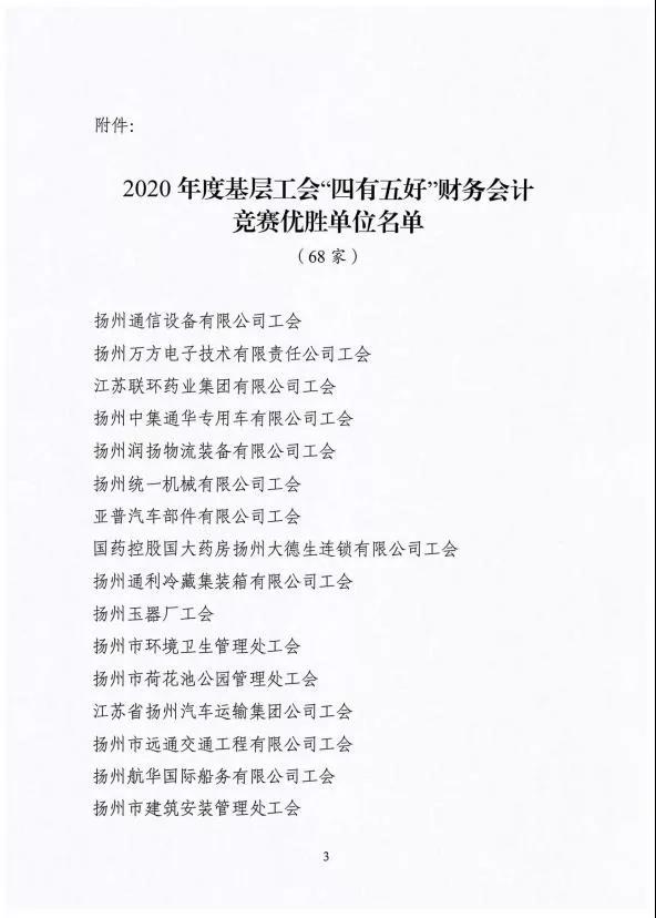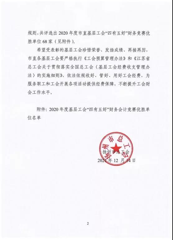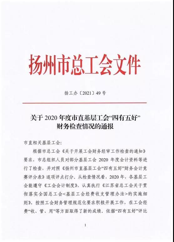 12月14日,市總工會發布了“關于2020年度市直基層工會‘四有五好’財務檢查情況的通報”,資產公司聯合基層工會榮列優勝單位榜單。