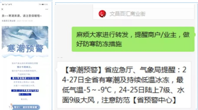 文昌百匯企劃部立刻撰寫“防寒防凍溫馨提示”,在微信公眾號(hào)和業(yè)主群同步發(fā)布,增強(qiáng)業(yè)主、商戶防寒防凍意識(shí),督促業(yè)主、商戶及時(shí)落實(shí)應(yīng)對(duì)措施,做好自身防護(hù);同時(shí)提醒業(yè)主注意用電用水安全。