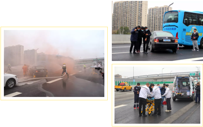 此次演練模擬場景為“受低溫雨雪冰凍天氣影響,高架橋上發生追尾,3人受傷、被困,現場行車中斷……”。經各相關部門逐級上報,啟動《揚州市快速路隧道交通事故處置應急預案》Ⅲ級響應后,市住建局、市應急管理局、市公安局、市消防救援支隊、市衛健委等部門立即組織救援隊伍趕赴事故現場進行處置。事故現場,在指揮部的統一指導下,各部門安全高效地完成了車輛疏導、救援駕乘人員、滅火處理等工作,避免了交通擁堵,事態擴大和危害蔓延。整個應急演練活動近35分鐘,演練過程有條不紊,達到了貼近實戰、以練促訓的效果。