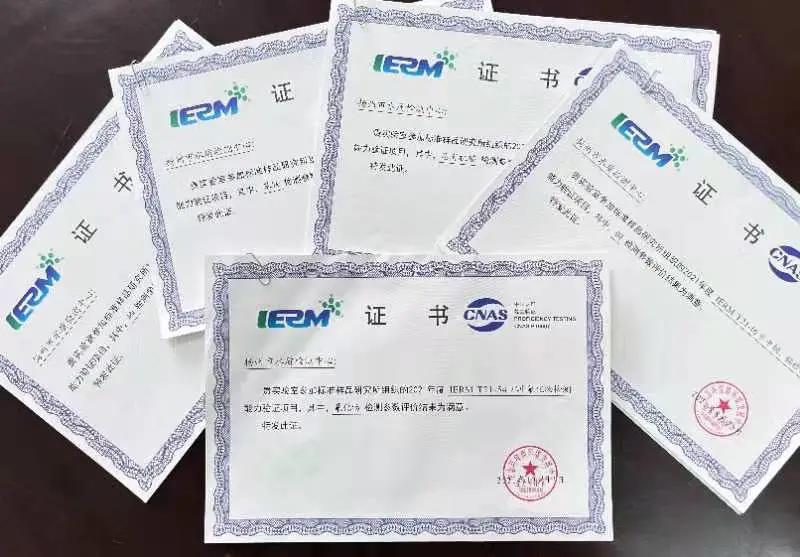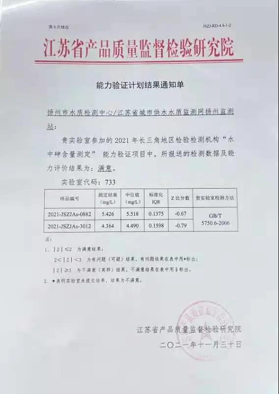 能力驗證是國家認監委考核CMA實驗室檢測能力的主要方法,通過發放盲樣考核各級實驗室檢測人員的檢測技能水平,能夠實事求是地反映實驗室的檢測能力。2021年,水質檢測中心通過國家生態環境部實驗室能力驗證,獲得氟化物等項目檢測滿意證書;通過江蘇省產品質量監督檢驗研究院組織的“長三角地區檢驗檢測機構”水質檢測能力驗證,也獲得項目檢測滿意證書。