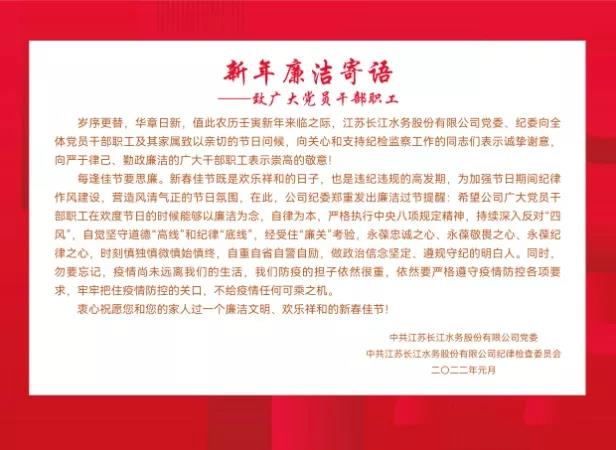 為認真貫徹落實城控集團紀委《關于進一步加強春節期間紀律作風建設的通知》要求,持續推進中央八項規定精神及其實施細則落地生根,嚴防“四風”問題反彈回潮,提醒黨員干部職工廉潔過節。春節前夕,長江水務公司紀委精心制作了100余份“新春廉潔卡”,向公司領導班子、各部門負責人及部分黨員干部職工送去了廉潔提醒和節日祝福,提醒大家把好節日廉潔“第一關口”,營造廉潔文明、歡樂祥和的節日氛圍。