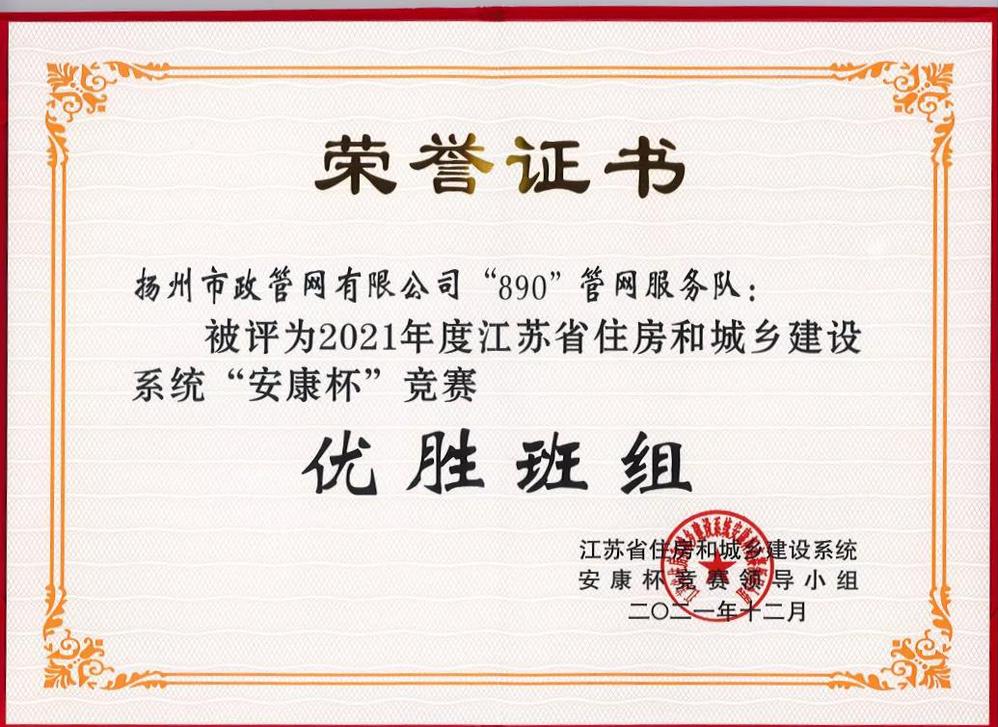 “安全壓倒一切,健康高于一切?!痹?021年度江蘇省住房和城鄉建設系統 “安康杯”競賽活動中,管網公司“890”管網服務隊榮獲“安康杯”競賽優勝班組榮譽稱號。