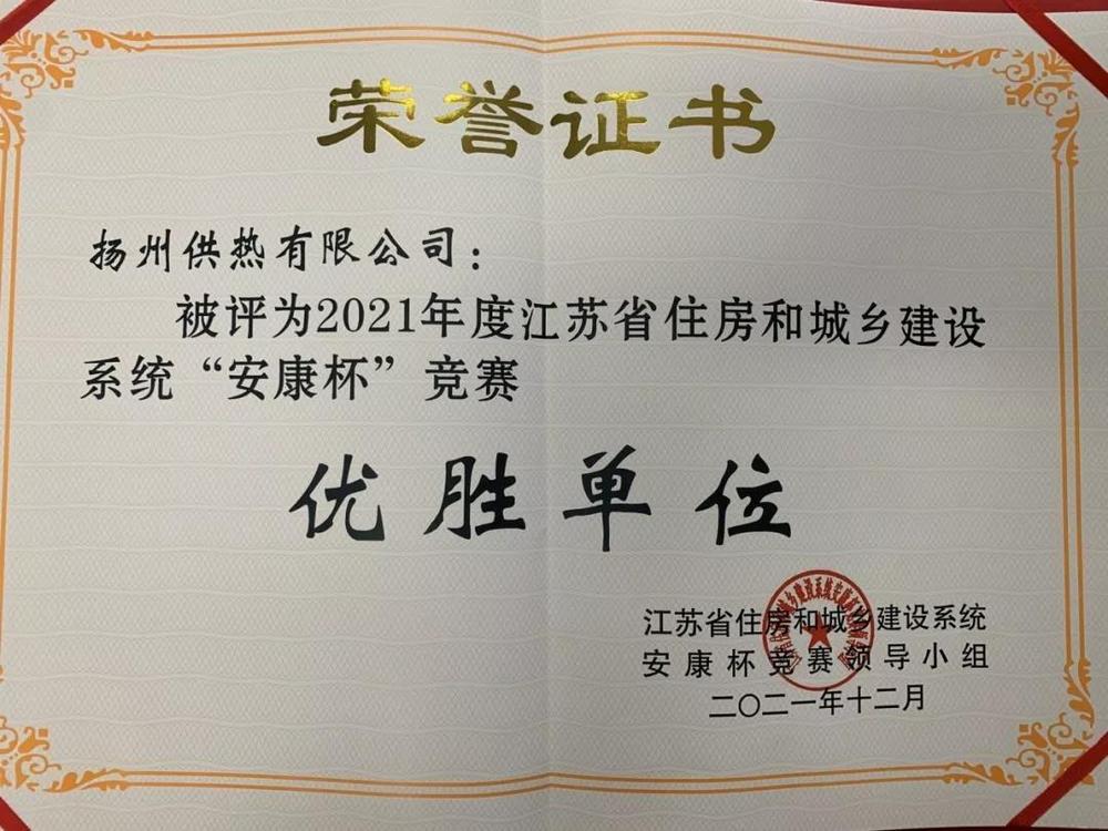 近日,在2021年度江蘇省住房和城鄉建設系統 “安康杯”競賽活動中,供熱公司榮獲“安康杯”競賽優勝單位榮譽稱號。