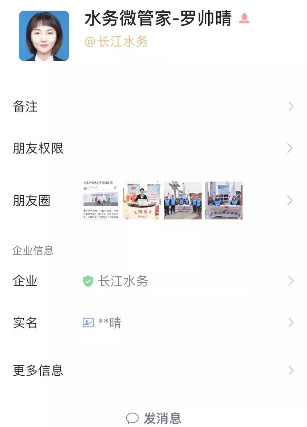 此次上線的共有5位“水務(wù)微管家”,分別對應(yīng)5家企業(yè)用戶,接下來還將繼續(xù)擴(kuò)充服務(wù)團(tuán)隊(duì)。“水務(wù)微管家”向企業(yè)用戶推送計(jì)劃停水、降壓供水、水質(zhì)報(bào)告、階梯水價(jià)、水費(fèi)明細(xì)、業(yè)務(wù)辦理、用水設(shè)施防凍保溫等自來水服務(wù)資訊。企業(yè)用戶亦可隨時(shí)向“水務(wù)微管家”在線了解、咨詢自來水相關(guān)業(yè)務(wù),實(shí)現(xiàn)“水務(wù)管家+企業(yè)用戶”一對一的服務(wù)。