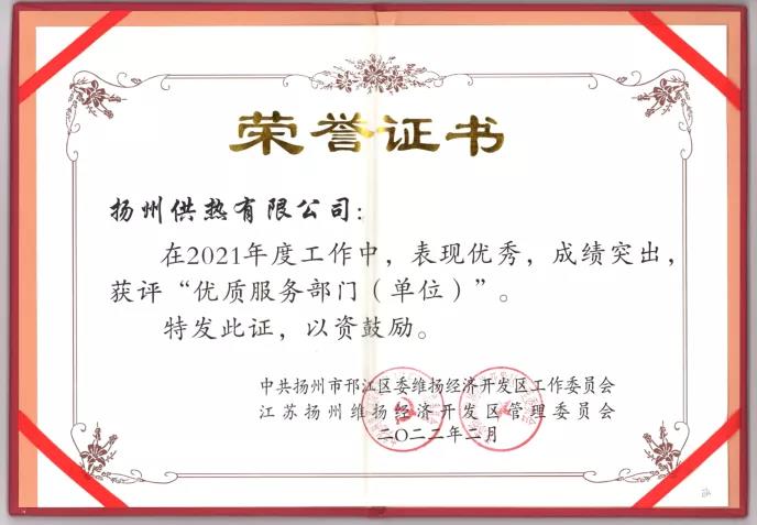 近日,在江蘇揚(yáng)州維揚(yáng)經(jīng)濟(jì)開發(fā)區(qū)2021年度經(jīng)濟(jì)社會(huì)發(fā)展先進(jìn)集體和先進(jìn)個(gè)人表彰大會(huì)上,供熱公司榮獲“優(yōu)質(zhì)服務(wù)單位”榮譽(yù)稱號(hào)。