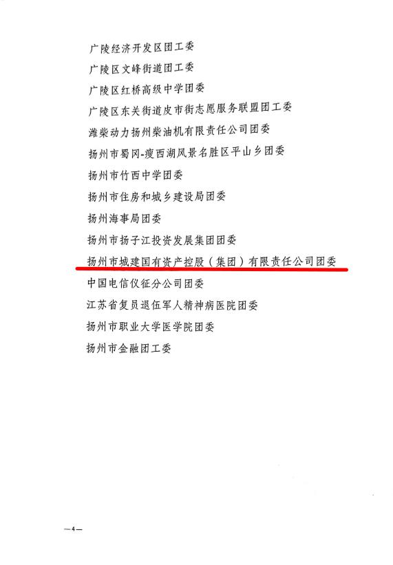 2022年是中國共青團成立100周年。近日,揚州團市委印發了《關于對2021年度揚州市“五四紅旗團委”“五四紅旗團支部”“新長征突擊手”“優秀共青團干部(團支部書記)”“優秀共青團員”予以表揚的通報》(揚團委發〔2022〕6號),城控集團團委被授予2021年度揚州市“五四紅旗團委”稱號。