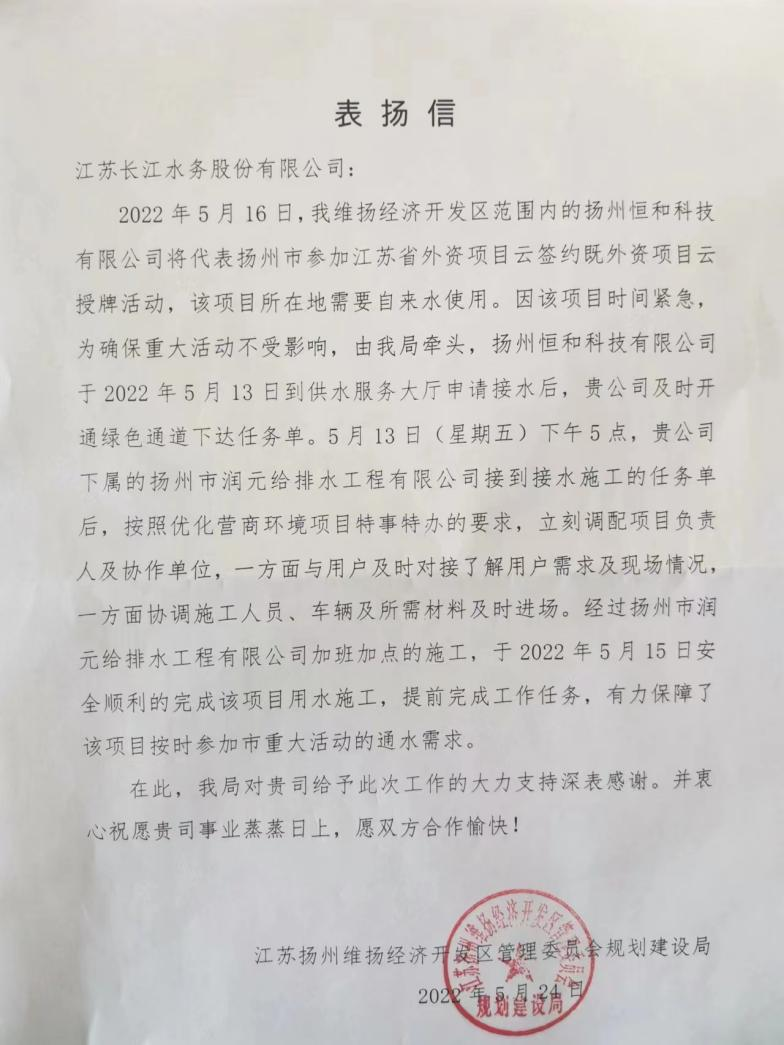 維揚經(jīng)濟開發(fā)區(qū)揚州恒和科技有限公司5月16日代表揚州市參加“江蘇省外資項目云簽約暨外資項目云授牌”活動,該項目所在地需要安裝使用自來水。由于時間緊迫,維揚經(jīng)濟開發(fā)區(qū)建設(shè)局牽頭于5月13日到長江水務(wù)供水服務(wù)大廳申請接水,長江水務(wù)及時開通綠色通道下達VIP任務(wù)單至潤元公司。潤元公司秉承 “全心全意為企業(yè)服務(wù)”的理念,急事急辦,特事特辦,全力解決用戶的后顧之憂。5月13日下午5點,迅速調(diào)配項目負責人及協(xié)作單位,一方面與用戶對接了解用戶需求及現(xiàn)場情況,一方面協(xié)調(diào)施工人員、車輛及所需材料快速進場,現(xiàn)場施工人員任勞任怨,加班加點于5月15日安全順利地提前完成了該項目用水施工,有力保障了該項目按時參加市重大活動的用水需求。
