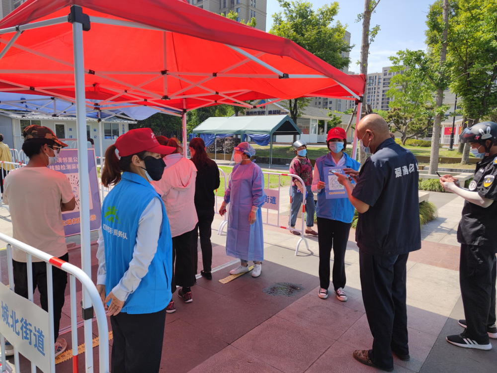 在采樣現場,志愿者熱心提醒群眾戴好口罩、保持一米距離、引導掃碼注冊登記或準備好身份證。志愿者們分工明確、組織有力,對前來采樣的居民進行有效分流,不僅減輕了醫護人員的工作負擔,也提升了核酸檢測工作的效率。
