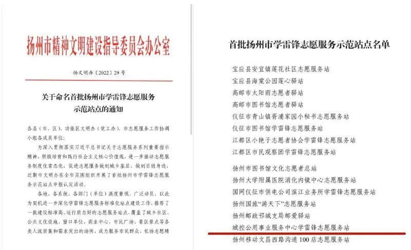 近日,從揚州市文明辦傳來喜報,城控公用事業(yè)服務(wù)中心(長江水務(wù)服務(wù)廳)被命名為2022年首批揚州市學(xué)雷鋒志愿服務(wù)示范站點。