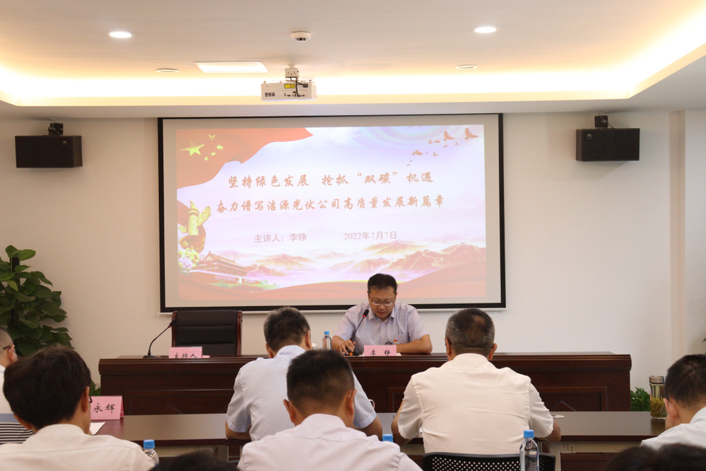 李錚以《堅持綠色發展、搶抓“雙碳”機遇,奮力譜寫潔源光伏公司高質量發展新篇章》為題,從“把綠色發展的底色鋪好,必須深刻領會抓內涵”“把綠色發展的底色鋪好,必須共謀共建強理念”“把綠色發展的底色鋪好,必須履職盡責抓落實”三個方面闡述了綠色發展的重要意義,分析了“雙碳”目標背景下新能源產業的發展機遇,并對潔源光伏公司下一步工作提出了具體要求。