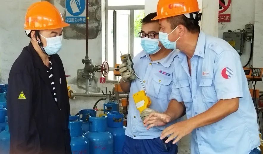 場站外,吳俊榮詳細詢問了液化氣場站的生產運行情況。接著,他戴上安全帽、換上防靜電工作服后,進入場站,對相關生產區域做了進一步了解。吳俊榮一行來到充裝臺,對液化氣灌裝作業進行了仔細觀摩。液化氣灌裝班組嚴格遵守灌裝制度,先觀察鋼瓶外觀,掃碼做充前檢查,然后“一瓶一碼、一掃一充”,用自動灌裝秤進行灌裝,再用可燃氣體報警儀檢漏,檢查無漏氣后,進行充后檢查的作業制度進行。灌裝人員分工明確,忙而不亂,灌裝流程井然有序。