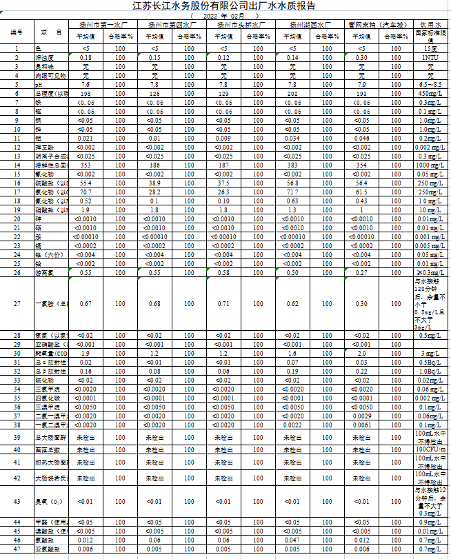 江蘇長江水務股份有限公司出廠水水質報告 ( 2022 年 02月 )