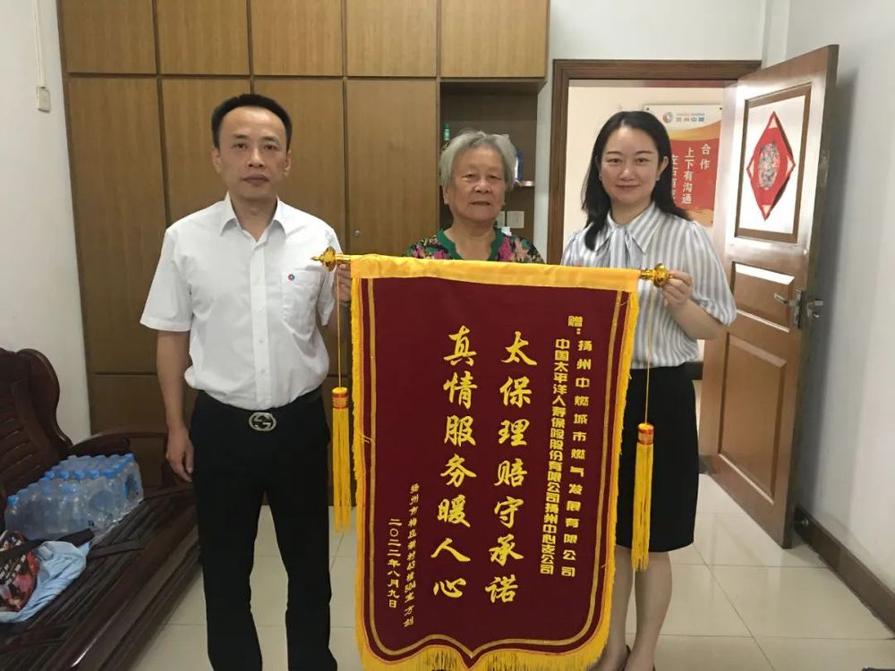 “錦旗早就做好了,前段時間連續高溫,所以今天才送過來。”8月25日下午3時許,家住市區梅莊新村79歲的孫大媽在女兒陪伴下,來到揚州中燃公司送上錦旗,感謝揚州中燃公司兌現承諾,為理賠提供全程綠色通道服務,使其獲得了經濟補償和心理慰藉。