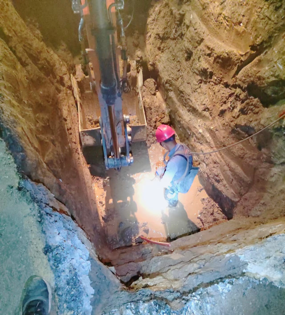 險情就是命令,搶修就是責任。管網(wǎng)公司在確定管道破損點后迅速組織搶修隊趕赴現(xiàn)場,第一時間關(guān)閉上游泵站、吸污車翻排泵站污水,杜絕漫溢事件的發(fā)生,同時組織人員巡查泵站周邊污水管道,與邗江交管、楊廟鎮(zhèn)等部門進行溝通與協(xié)調(diào)。由于施工現(xiàn)場情況復雜,漏水管道深埋地下,給搶修工作帶來一定的難度。中午12點,搶修隊在制定出具體搶修方案后,當即決定立刻進行機械開挖。