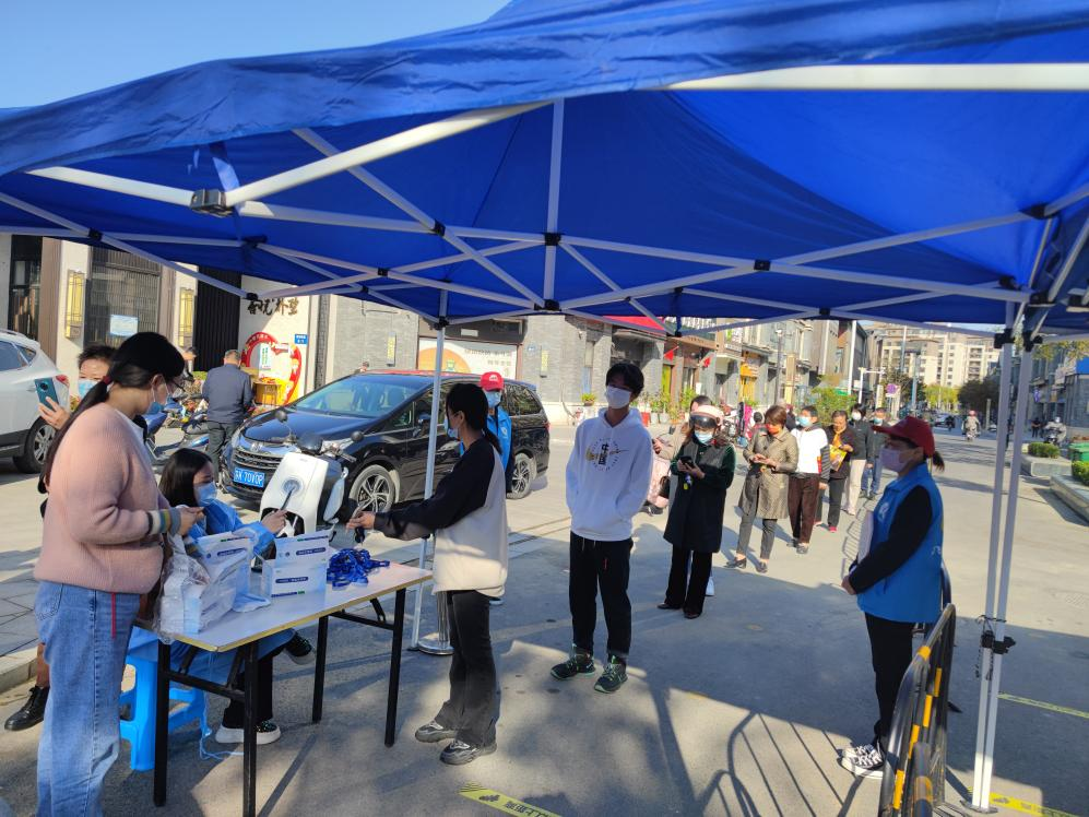 10月24日,在吾悅樸墅東門核酸檢測服務點,“e飛揚”志愿服務隊志愿者正在協助專業人員進行信息登記、秩序維護、采樣咨詢服務,這是服務隊兩周來第3次助力社區核酸檢測。