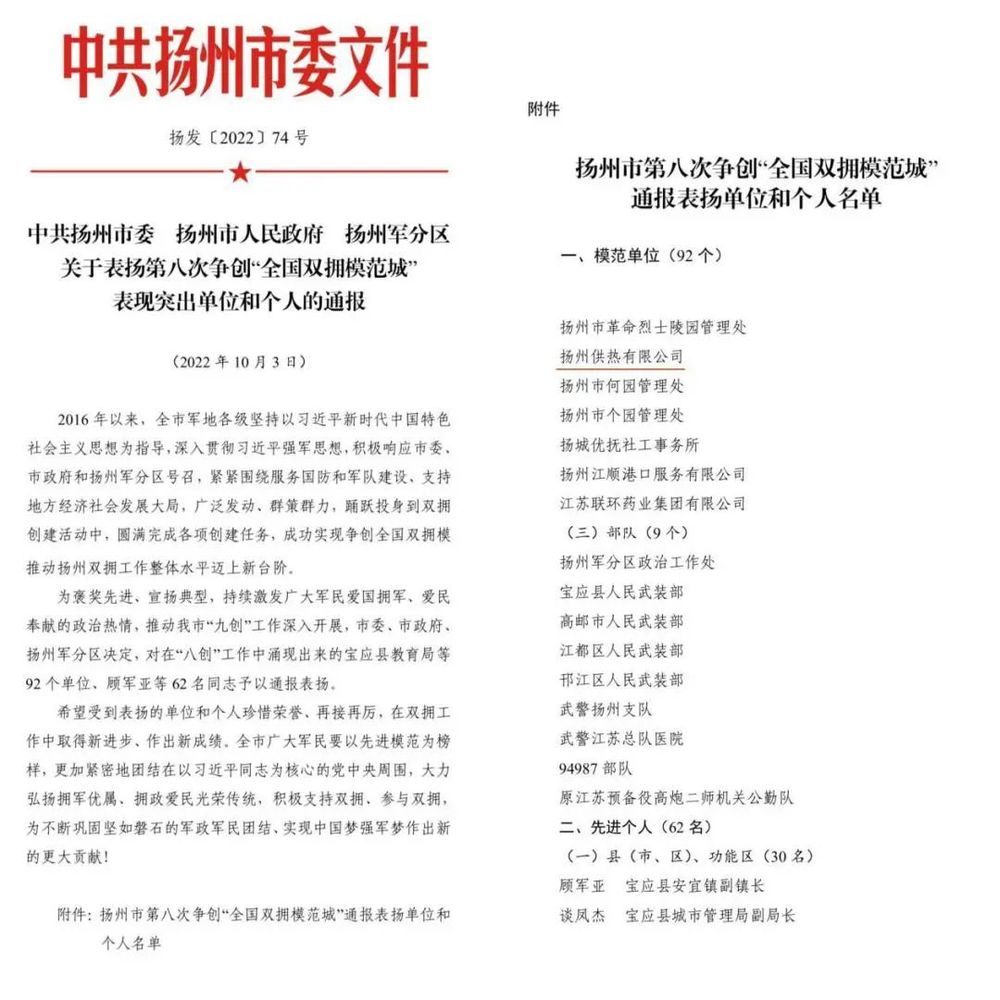 近日,揚州市市委、市政府、軍分區印發表彰決定,揚州供熱有限公司榮獲第八次爭創“全國雙擁模范城”表現突出單位。供熱公司始終把雙擁工作當作新時期凝聚軍心民心、加快經濟發展的一項重要工作來落實,求真務實,開拓創新,為我市成功實現爭創全國雙擁模范城“八連冠”目標奠定了堅實的基礎。
